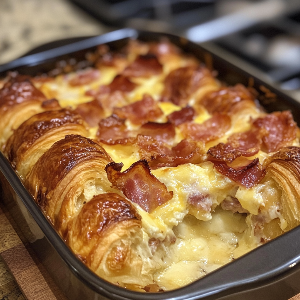 A delicious and hearty breakfast casserole made with layers of croissants, eggs, cheese, and crispy bacon.