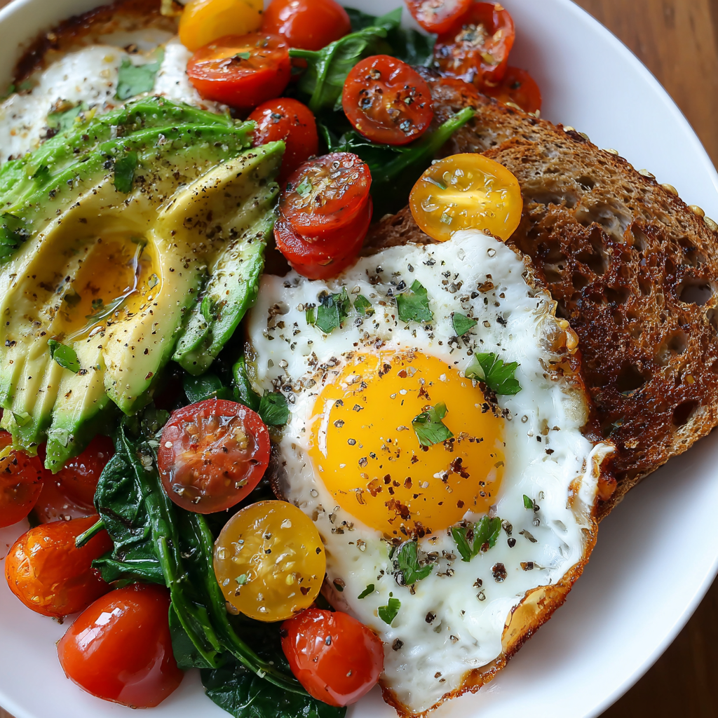 It’s time to bring everything together! Start with the toasted bread as your base. Then, place the eggs on top, followed by the sautéed spinach. Arrange the avocado slices and cherry tomatoes around the plate. This colorful presentation will make your breakfast look as good as it tastes!