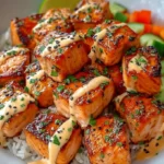 Crispy and flavorful salmon bites drizzled with creamy Bang Bang sauce, served over rice with fresh vegetables.