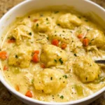 The aroma of chicken simmering in savory broth wafts through the kitchen, embracing you in warmth as you anticipate the delightful comfort that awaits. As the broth bubbles softly, the steaming scent intertwines with the freshness of diced carrots and celery, filling the air with a promise of heartiness and home. And then there are the dumplings—light, fluffy, and pillowy—each one whispering sweet nothings of warmth and satisfaction. With every bite, the flavors marry into a symphony of creaminess, seasoned perfectly, creating a dish that warms more than your belly; it wraps around your soul like a grandmother’s loving hug.