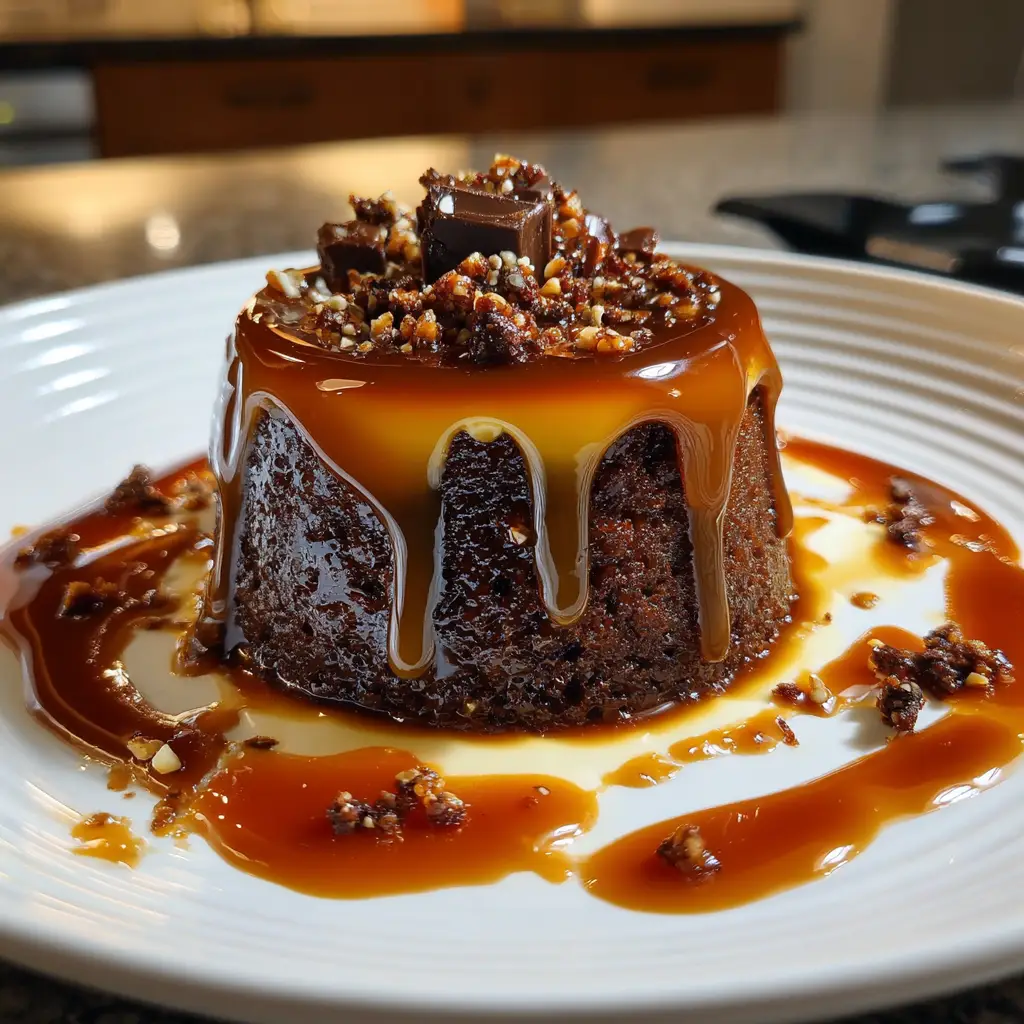 A deliciously moist chocolate cake infused with caramel and topped with toffee bits, perfect for impressing guests.
