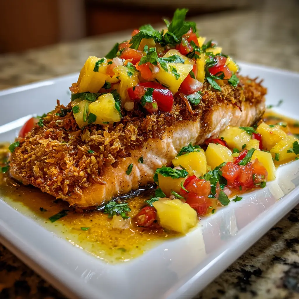 A delicious and tropical dish featuring salmon coated in crispy coconut and served with a refreshing pineapple salsa.