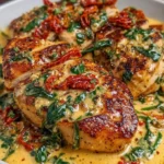 Indulge in this creamy Keto Tuscan Chicken with Spinach, featuring succulent chicken, vibrant spinach, and rich sun-dried tomatoes cooked in a luscious cream sauce.