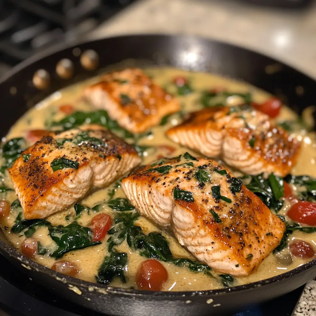 A delicious and quick dinner recipe featuring salmon cooked in a creamy Tuscan sauce with spinach and sun-dried tomatoes.