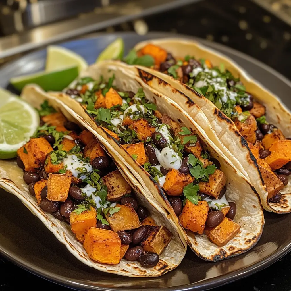 Delicious and crispy tacos filled with sweet potatoes and black beans, perfect for a satisfying meal.