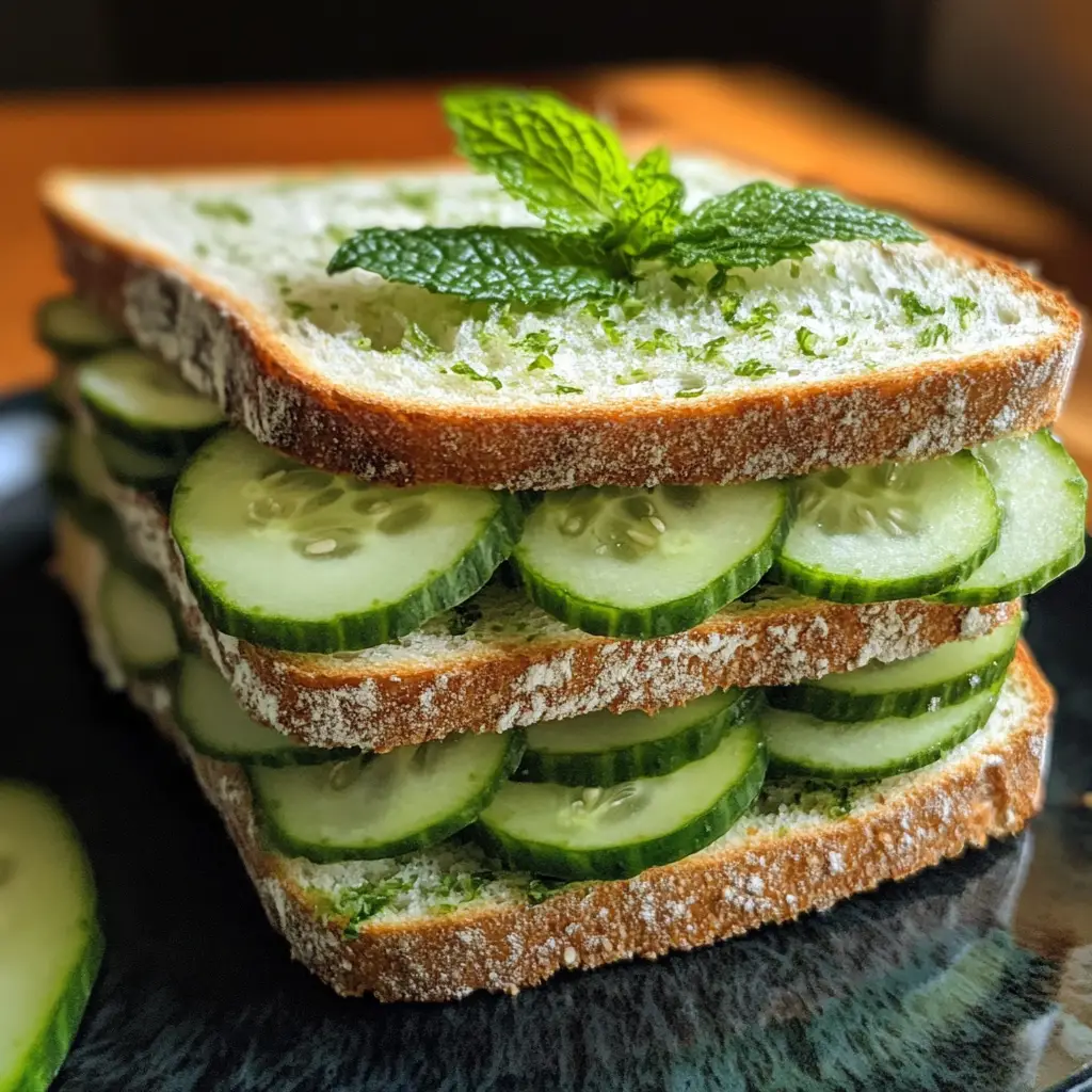 A refreshing and light tea sandwich made with cucumber and mint, perfect for afternoon tea or a light snack.