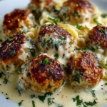 Tender meatballs made from ground chicken and ricotta, swimming in a creamy Alfredo sauce, perfect for cozy dinners and festive gatherings.