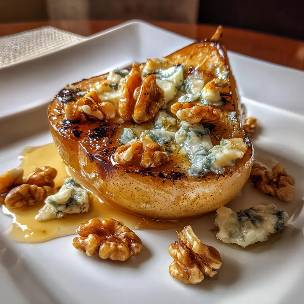 A simple yet elegant dessert featuring roasted pears topped with blue cheese, walnuts, and a drizzle of honey.