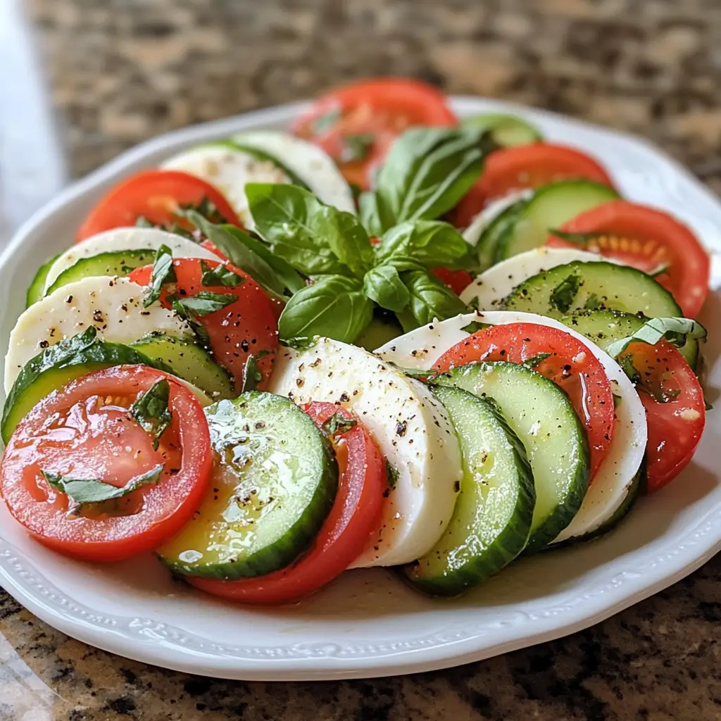 A refreshing and light salad perfect for summer, combining fresh cucumbers, tomatoes, mozzarella, and basil.