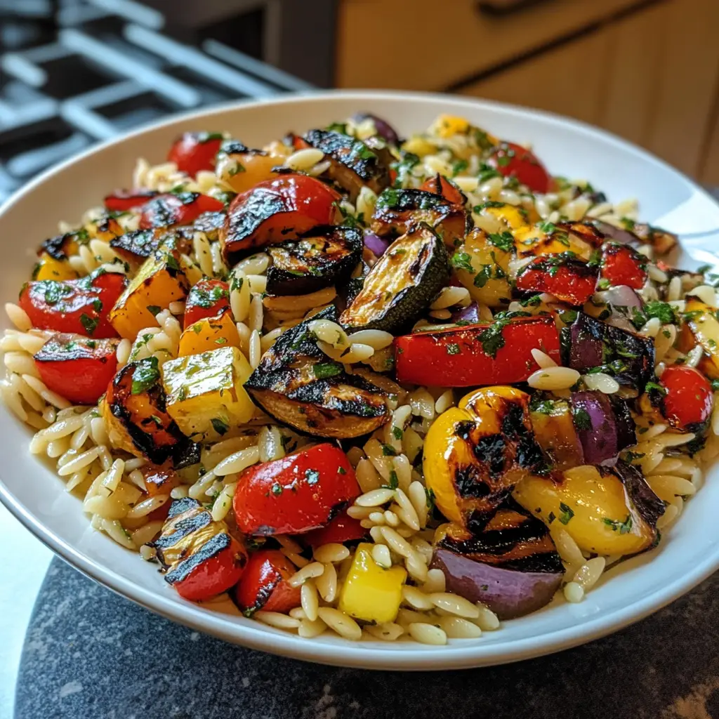 A refreshing and vibrant salad featuring grilled vegetables and orzo pasta, perfect for summer gatherings.