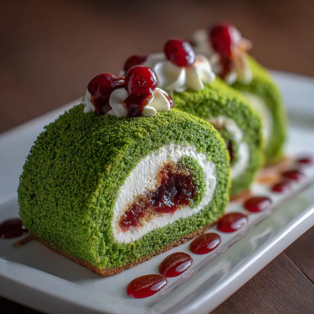 A delightful and festive Grinch Cake Roll that captures the spirit of the holiday season with its vibrant green color and delicious flavors.