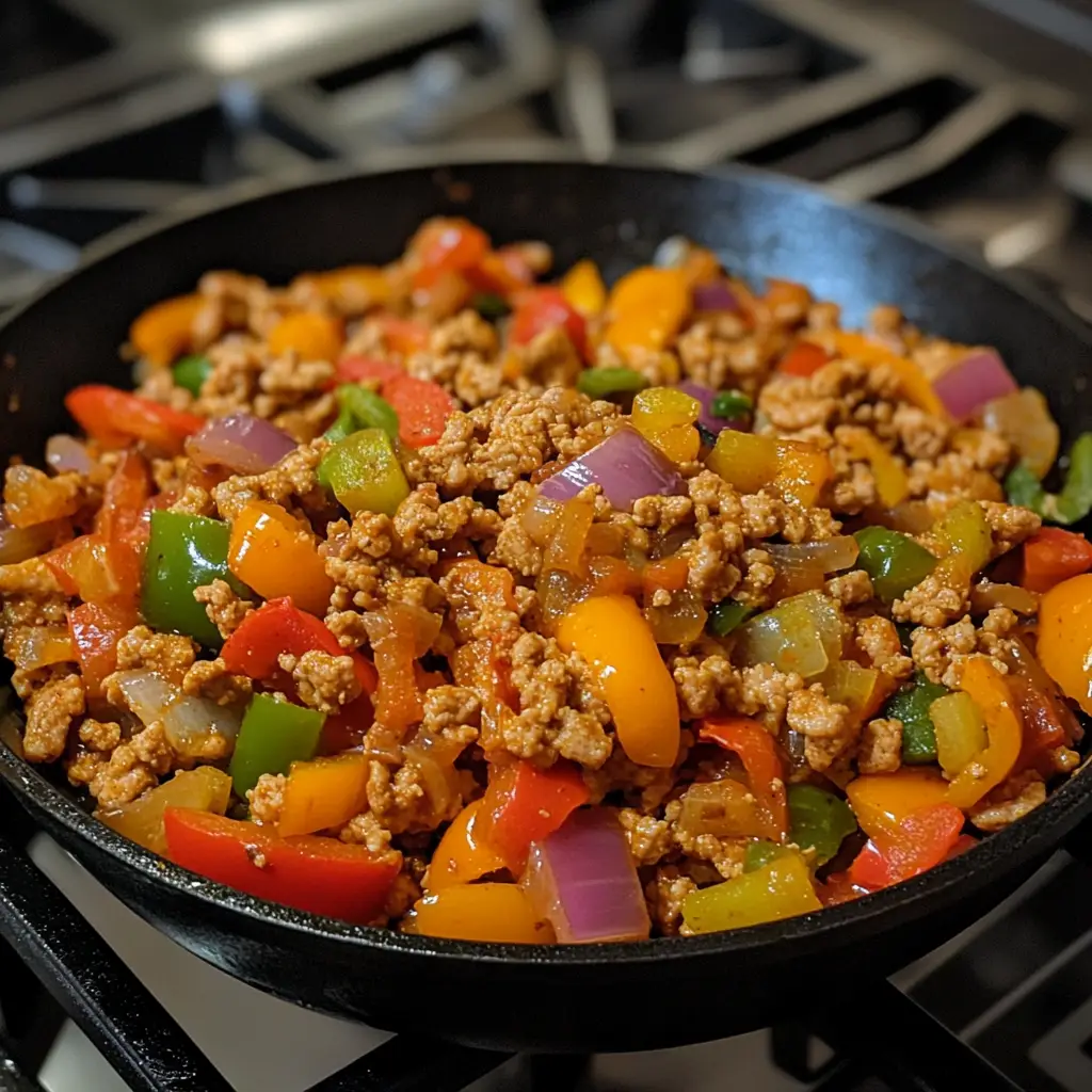A quick and delicious skillet dish featuring ground turkey and colorful bell peppers, perfect for a weeknight dinner.