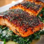 Deliciously seasoned salmon fillets with a blackened crust, paired with sautéed spinach and melted Parmesan cheese.