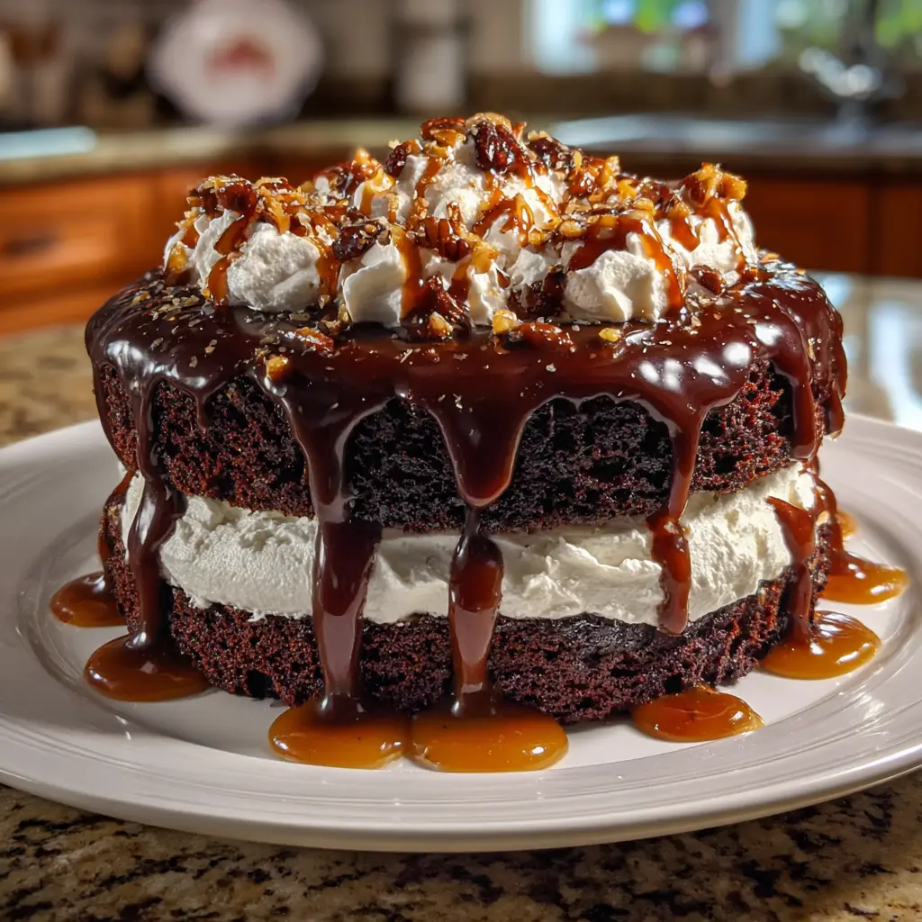 A rich and decadent chocolate turtle cake topped with caramel and pecans, perfect for any occasion.