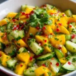 - Dress the Salad: Pour the zesty dressing over the mango and cucumber mixture. Gently toss everything together, allowing the flavors to mingle without mushing the mangoes.