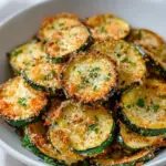 Deliciously crispy zucchini chips baked to perfection with parmesan and garlic seasoning, offering a guilt-free snacking experience.