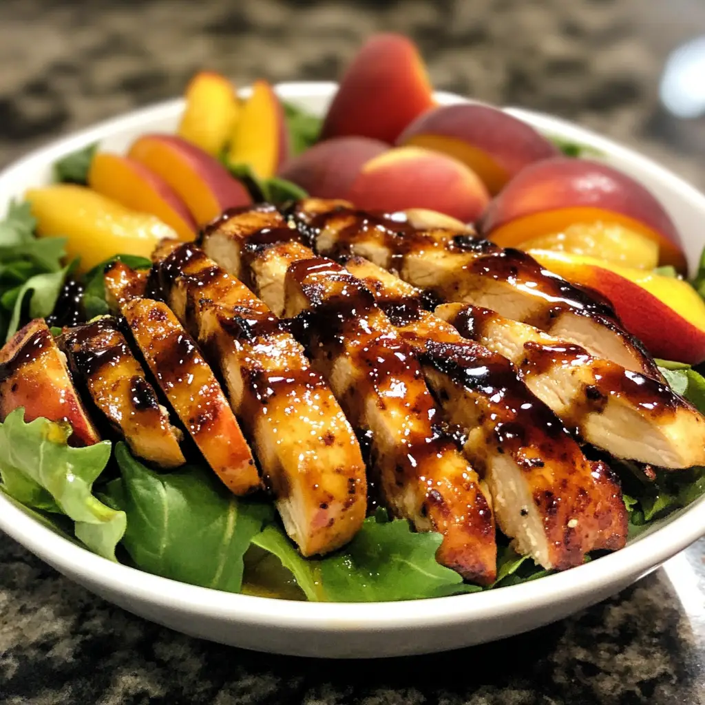 A refreshing summer salad featuring grilled chicken, juicy peaches, and a tangy balsamic dressing.