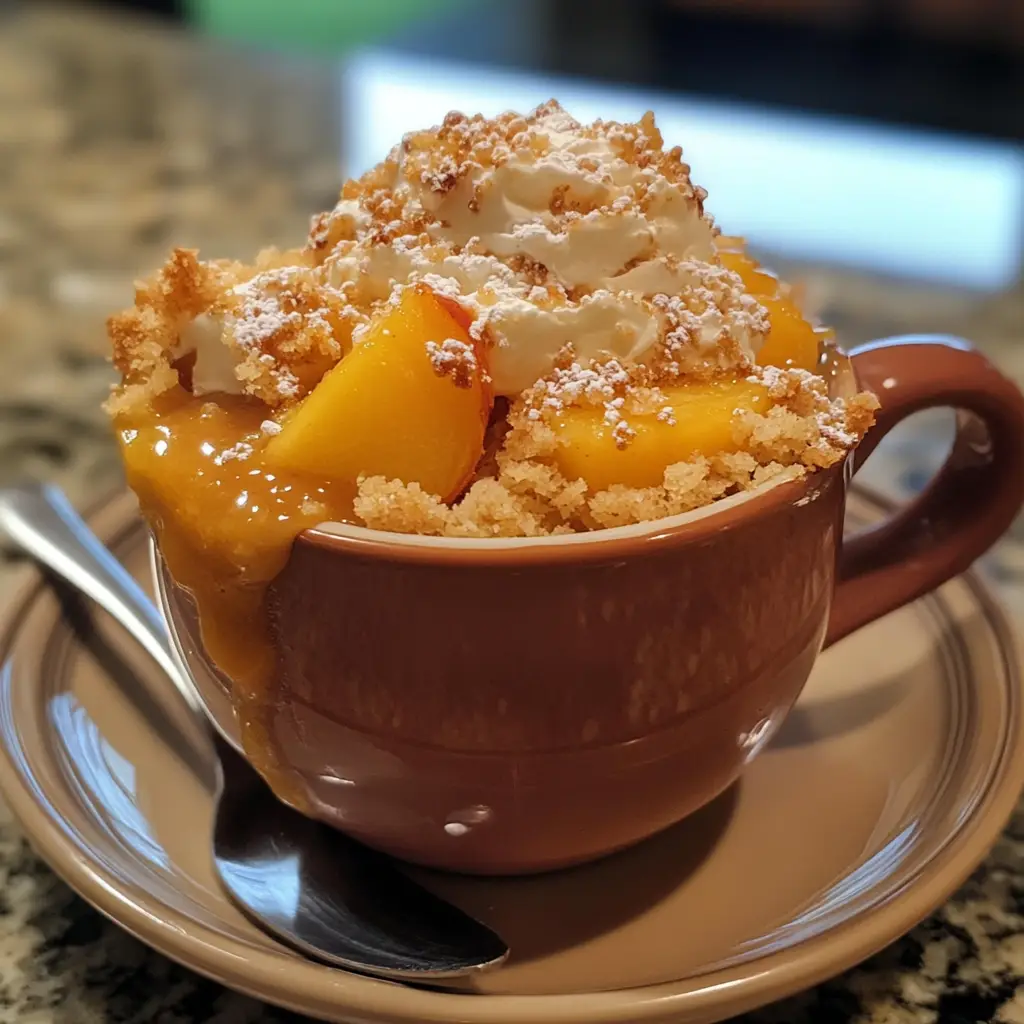 A quick and easy dessert that combines the flavors of peach cobbler in a single serving mug cake.