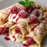 Delicate, light, and fluffy crepes filled with velvety vanilla cream and fresh raspberries, perfect for breakfast, brunch, or dessert.