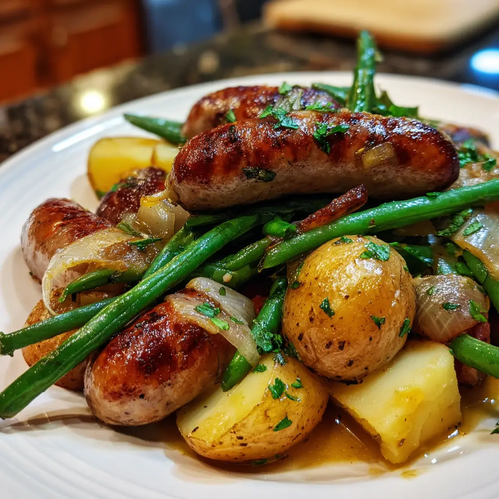 A simple and hearty dish made with sausage, potatoes, and green beans, cooked to perfection in a slow cooker.