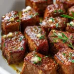 Tender morsels of steak infused with buttery richness and aromatic garlic, perfect for any occasion.