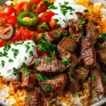 - Assemble the bowl: Divide rice into bowls, drizzle queso sauce over, and layer steak strips on top.