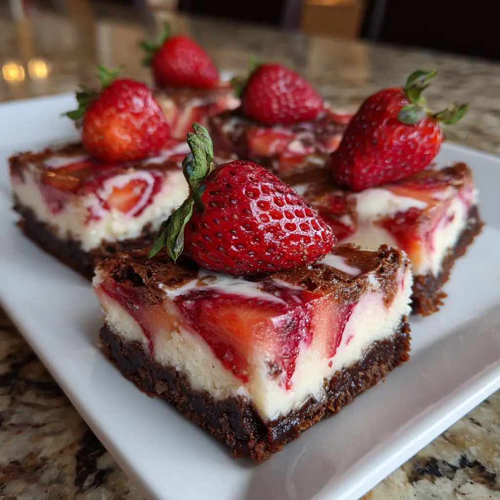 Delicious strawberry cheesecake bars with a rich fudgy brownie crust, perfect for dessert lovers.