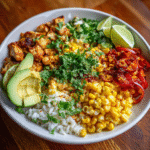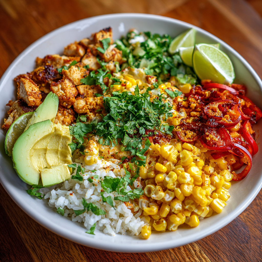A delicious and vibrant Street Corn Chicken Rice Bowl that combines tender chicken, sweet corn, and flavorful spices for a satisfying meal.