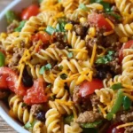 A vibrant summer dish that combines rotini pasta, ground beef, and colorful veggies in a creamy dressing for a refreshing take on classic tacos.