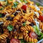 Make-ahead tips: Prepare everything except the lettuce and Doritos in advance for a fresh finish. Avoid overcooking the pasta for best texture.