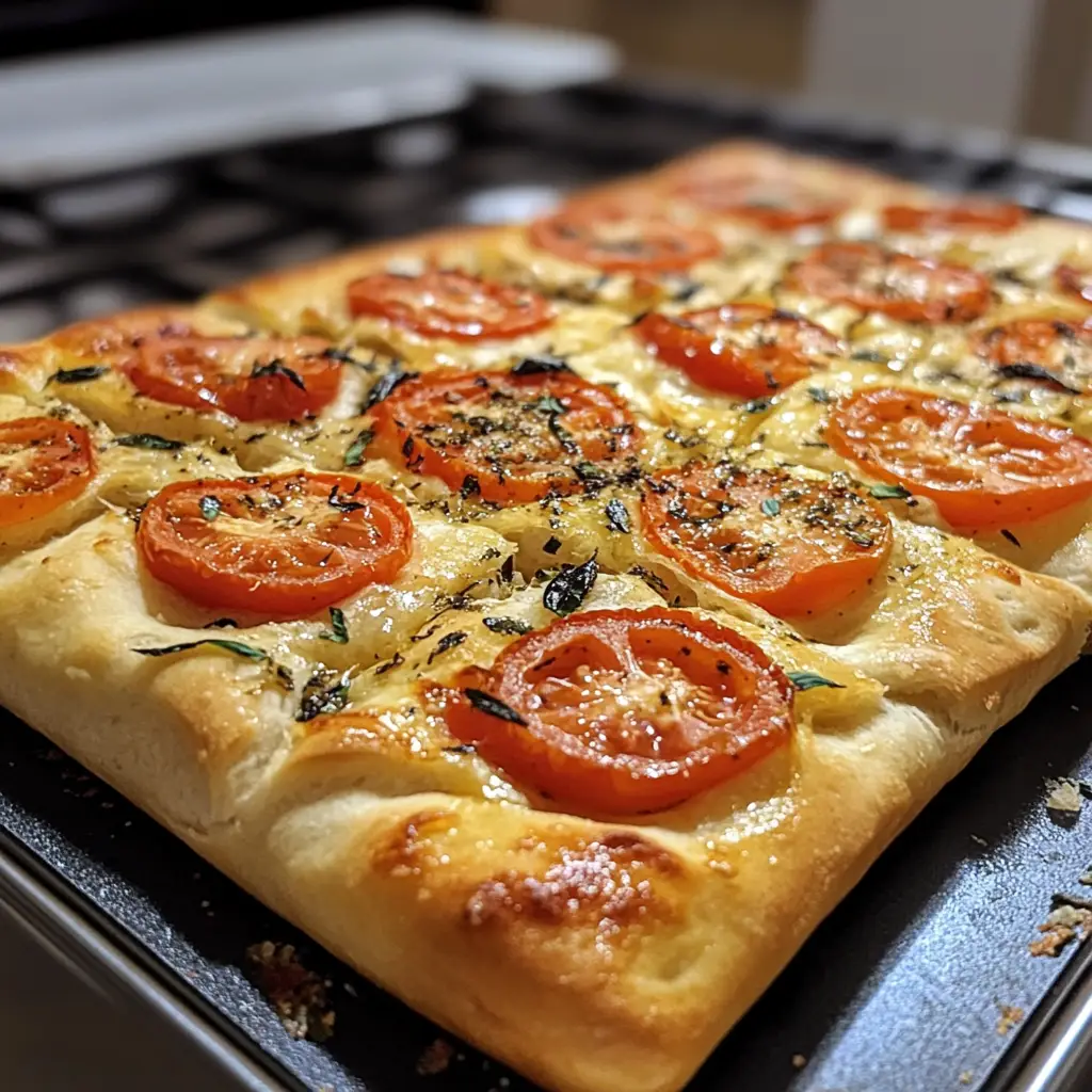 A delicious and aromatic focaccia bread topped with fresh tomatoes and basil, perfect for any occasion.