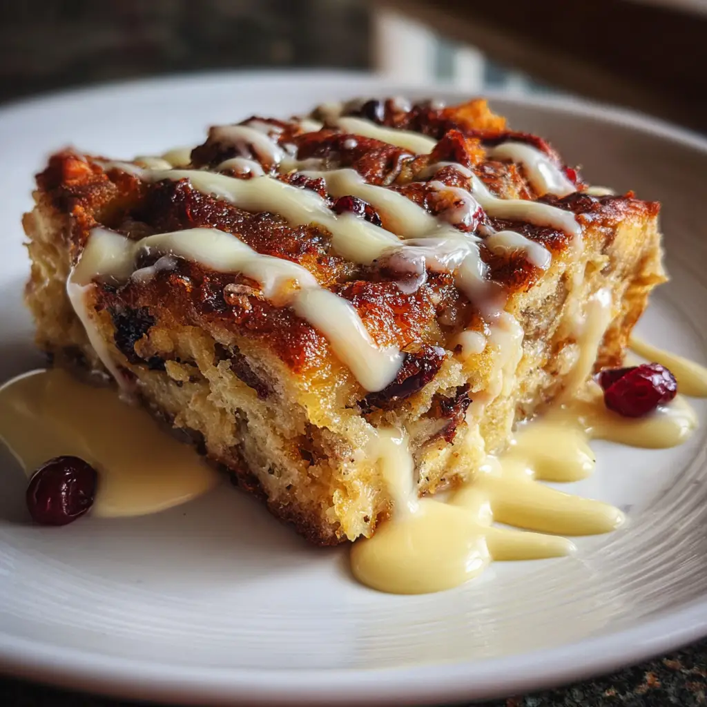A delicious and indulgent dessert featuring white chocolate and tart cranberries baked into a rich bread pudding.